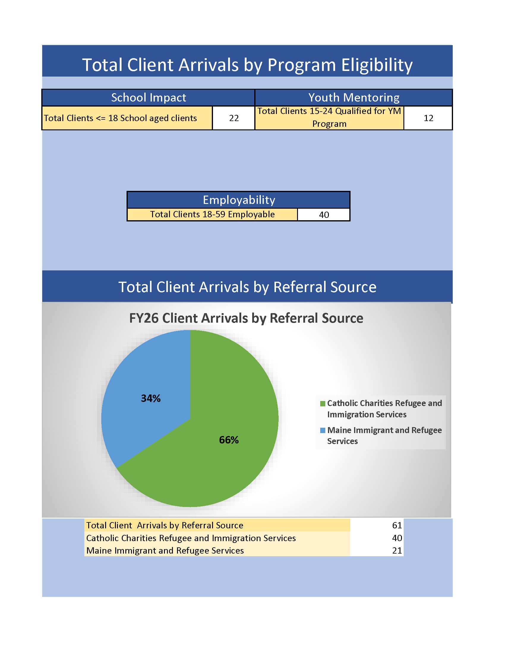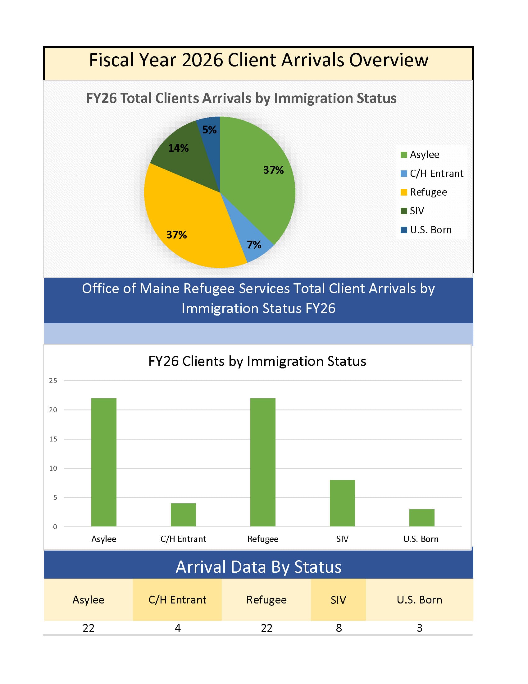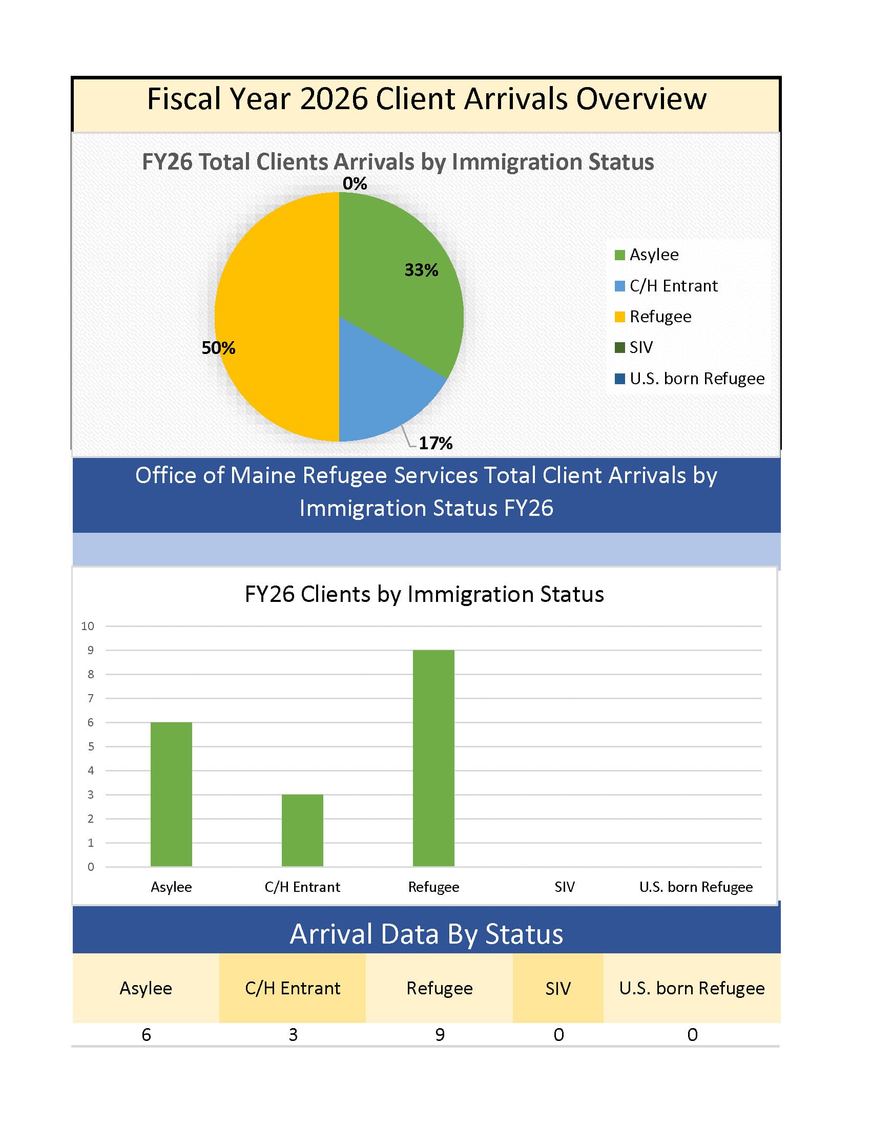 Due to administrative policies, we only received 8 new ORR eligible populations from 10/01/2025 till 10/31/2025 in Maine. To protect client confidentiality, we will refrain from providing cumulative population breakdowns till at least December 2025.